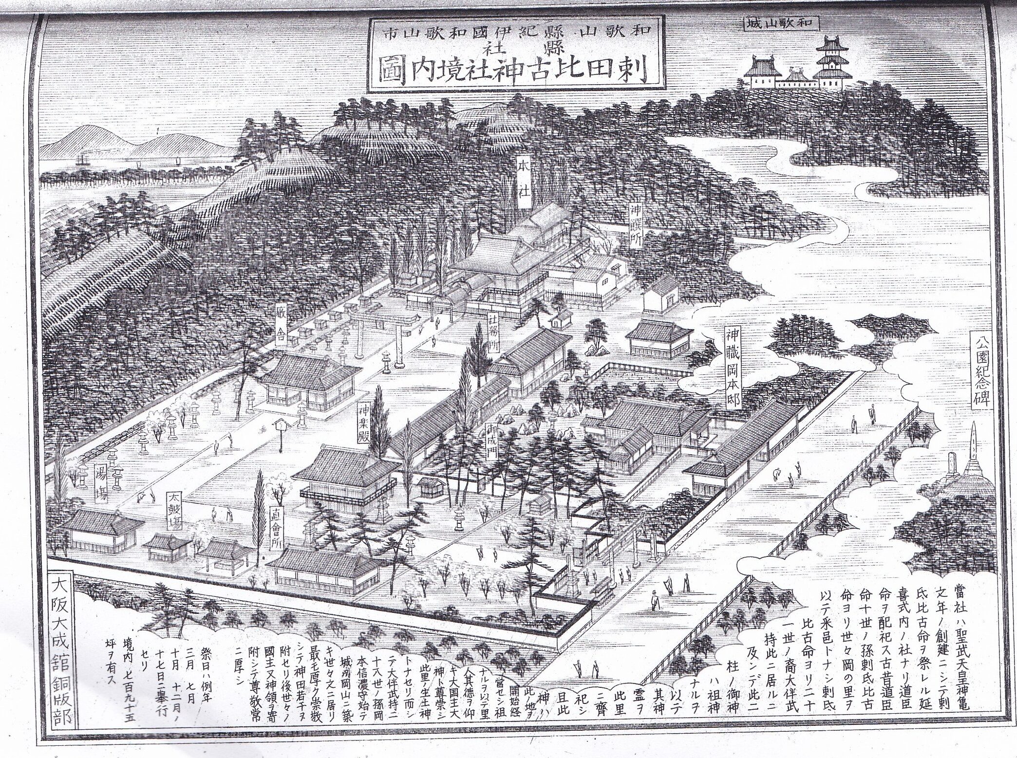 当神社は明治維新のさい県社に認定され、明治30年ごろに境内が整備されました。拝殿、廰舎等は『紀伊国名所図会』とは異なっています。境内中央には廰舎があり、殺生禁止の立て札がたてられています。